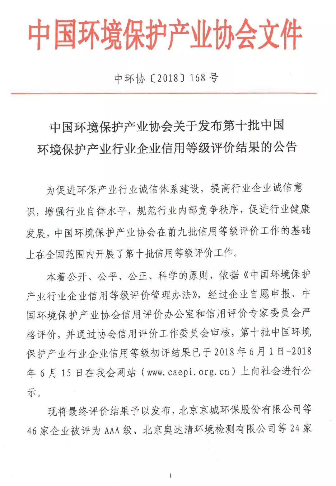 久科環保獲中國環境保護產業協會企業信用等級評價AAA評級