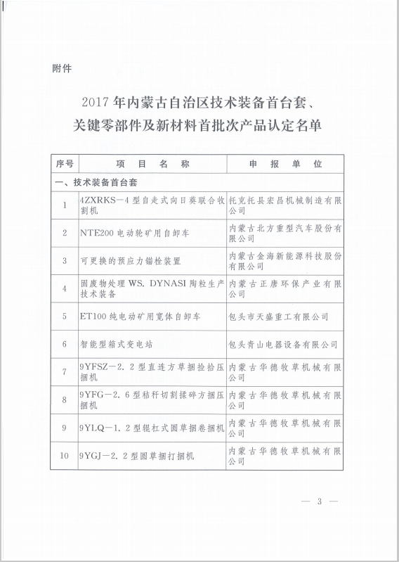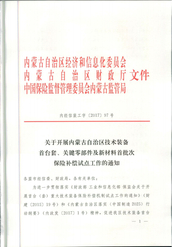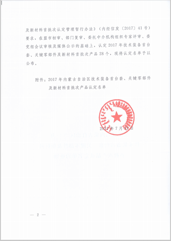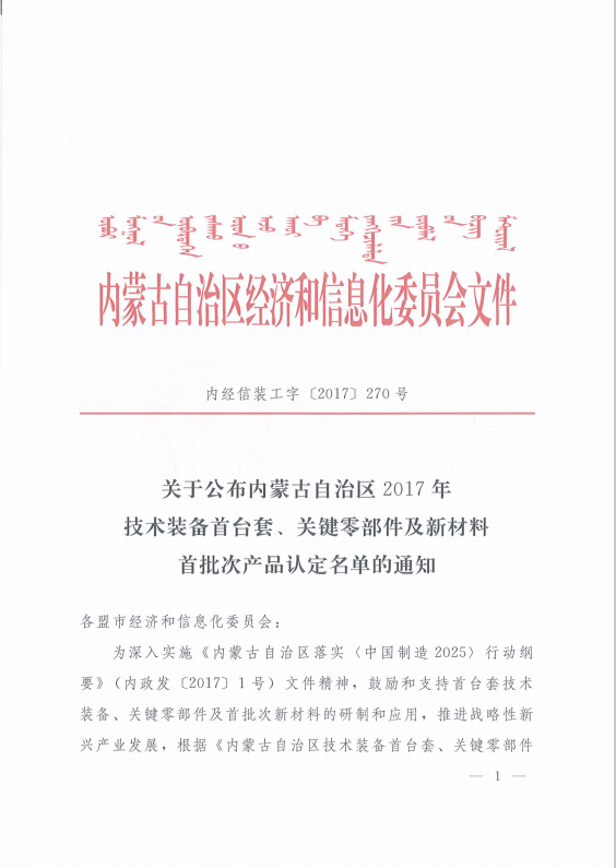 2017年(nian)7月12日(ri),內蒙古(gu)自治(zhi)區經濟和信息化委(wei)員會公布了內蒙古(gu)自治(zhi)區2017年(nian)技術裝備首臺套、關鍵零部件及新材料首批次產品(pin)認定名單,久科環保(bao)的煤化工高含鹽(yan)難降解有機廢水處理與分質鹽(yan)資源化設備成功入圍。