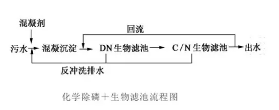 該工藝優點是工藝流程簡單,控制方(fang)便;但藥劑(ji)耗量(liang)較(jiao)(jiao)大,剩余污泥較(jiao)(jiao)多,同(tong)時由(you)于混凝沉(chen)淀去除一部(bu)分有機物(wu)(wu),有可(ke)能引起后續反硝化碳源(yuan)不足(zu)。另(ling)外一種是同(tong)步(bu)沉(chen)淀與絮(xu)凝過濾(lv),即在(zai)曝氣生(sheng)物(wu)(wu)濾(lv)池(chi)中投加(jia)化學藥劑(ji),沉(chen)淀物(wu)(wu)積聚在(zai)填料中,通(tong)過周期性反沖洗(xi),將(jiang)磷排出系(xi)統外,達到除磷的(de)目的(de),該工藝藥劑(ji)量(liang)相(xiang)對(dui)較(jiao)(jiao)小,但是污泥被(bei)截留在(zai)曝氣生(sheng)物(wu)(wu)濾(lv)池(chi)內,會縮(suo)短生(sheng)物(wu)(wu)濾(lv)池(chi)的(de)運行周期,增加(jia)反沖洗(xi)的(de)頻率。