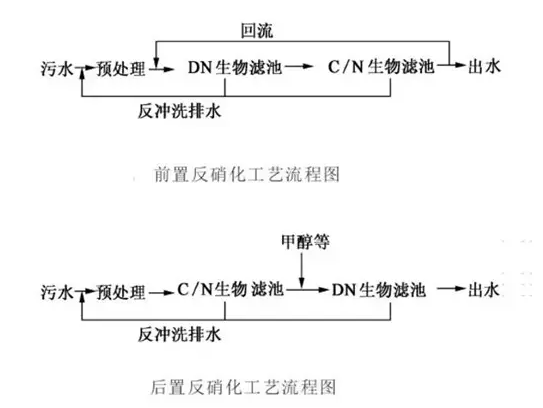 后(hou)置反硝化是(shi)廢水首先經過(guo)硝化濾(lv)(lv)池(chi)或濾(lv)(lv)池(chi)的(de)(de)好氧段,出水進入DN濾(lv)(lv)池(chi)或濾(lv)(lv)池(chi)的(de)(de)DN段,后(hou)置脫氮技術不利的(de)(de)一面是(shi)需要外加碳源,運行成本相對(dui)較高,同時(shi)如何投(tou)加適當劑(ji)量的(de)(de)碳,需要可靠的(de)(de)控(kong)制和穩定的(de)(de)進水濃度,同時(shi)出水需要進行曝(pu)氣去除過(guo)量的(de)(de)碳。典(dian)型反硝化流程: